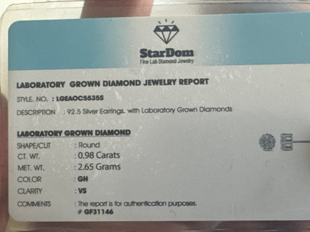 .98 CARAT STERLING SILVER 7.5 MM CERTIFIED LAB GROWN DIAMONDS STUDS EARRINGS