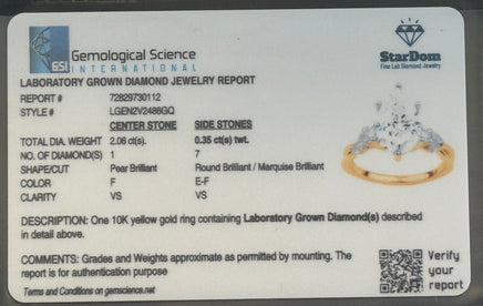 10K YELLOW GOLD 2.41 CARAT CERTIFIED LAB GROWN DIAMONDS PEAR RING