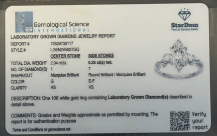 10K WHITE GOLD 2.37 CARAT CERTIFIED LAB GROWN DIAMONDS MARQUISE RING