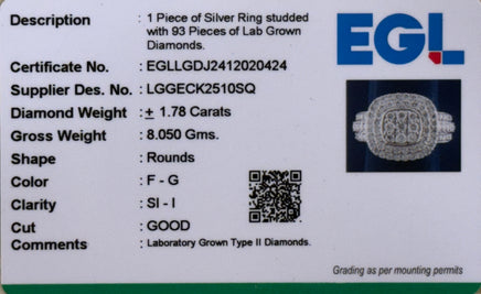 1.78 CARAT EGL CERTIFIED LAB GROWN DIAMONDS STERLING SILVER RING