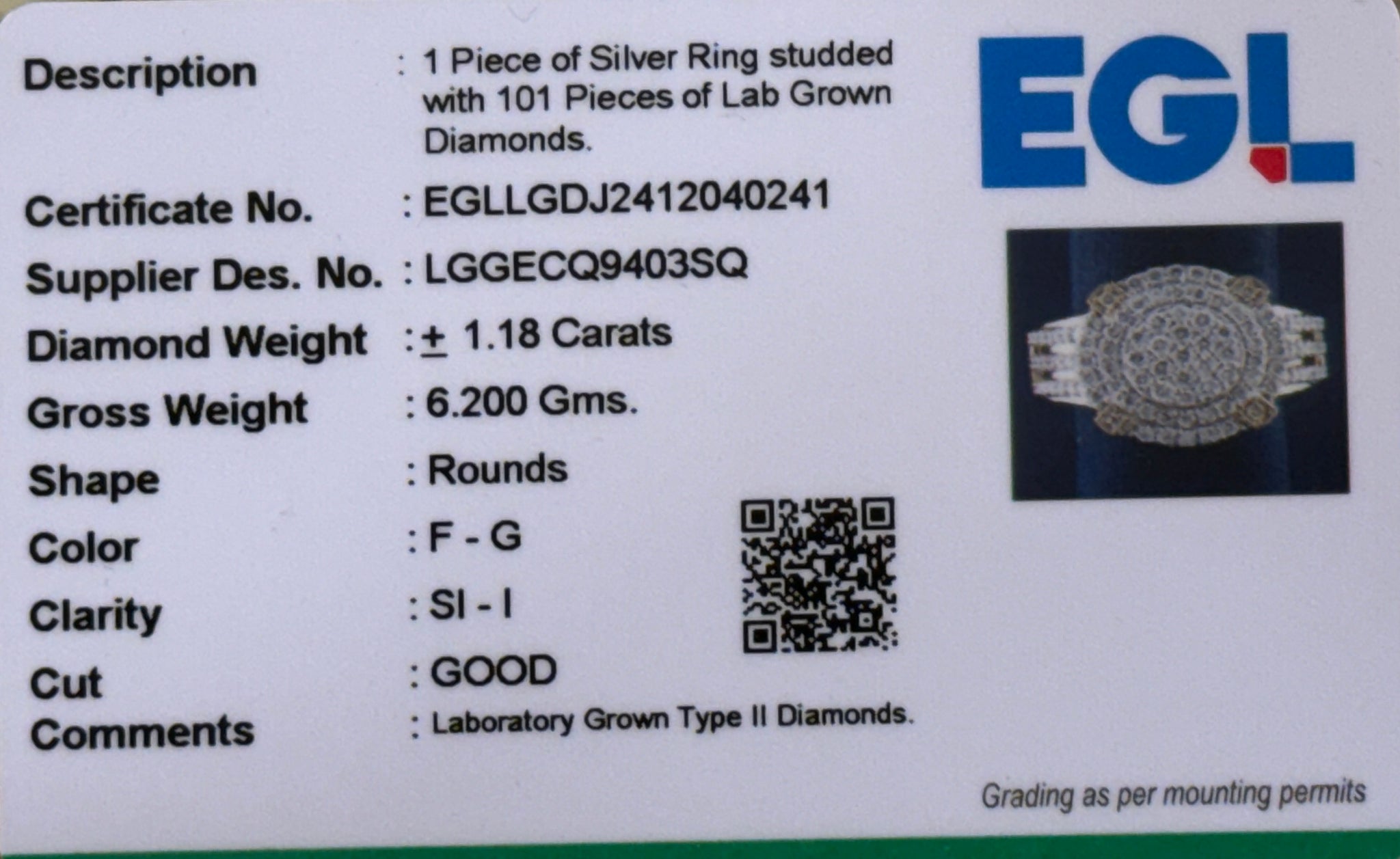 1.18 CARAT EGL CERTIFIED LAB GROWN DIAMONDS STERLING SILVER RING