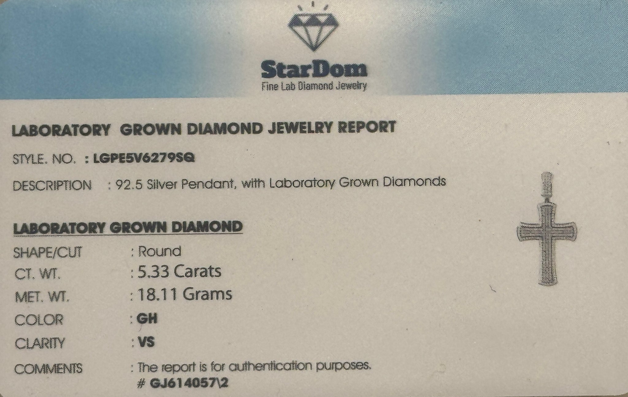 5.33 CARAT CERTIFIED LAB GROWN DIAMONDS STERLING SILVER 3 INCHES CROSS PENDANT