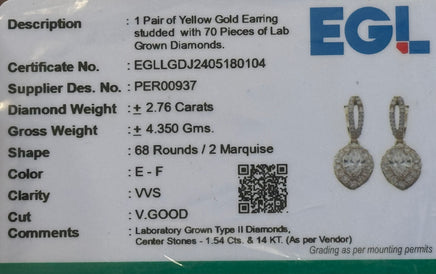 14K YELLOW GOLD 2.76 CARAT MARQUISE CERTIFIED LAB GROWN DIAMONDS STUDS EARRINGS HOOPS
