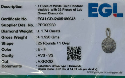 14K WHITE GOLD 1.74 CARAT OVAL CERTIFIED LAB GROWN DIAMOND PENDANT