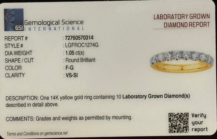 14K YELLOW GOLD 1.05 CARAT CERTIFIED LAB GROWN DIAMONDS RING BAND