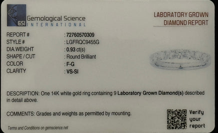 14K WHITE GOLD .93 CARAT CERTIFIED LAB GROWN DIAMONDS RING BAND