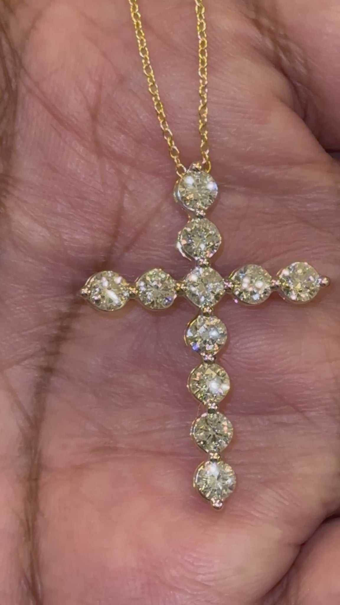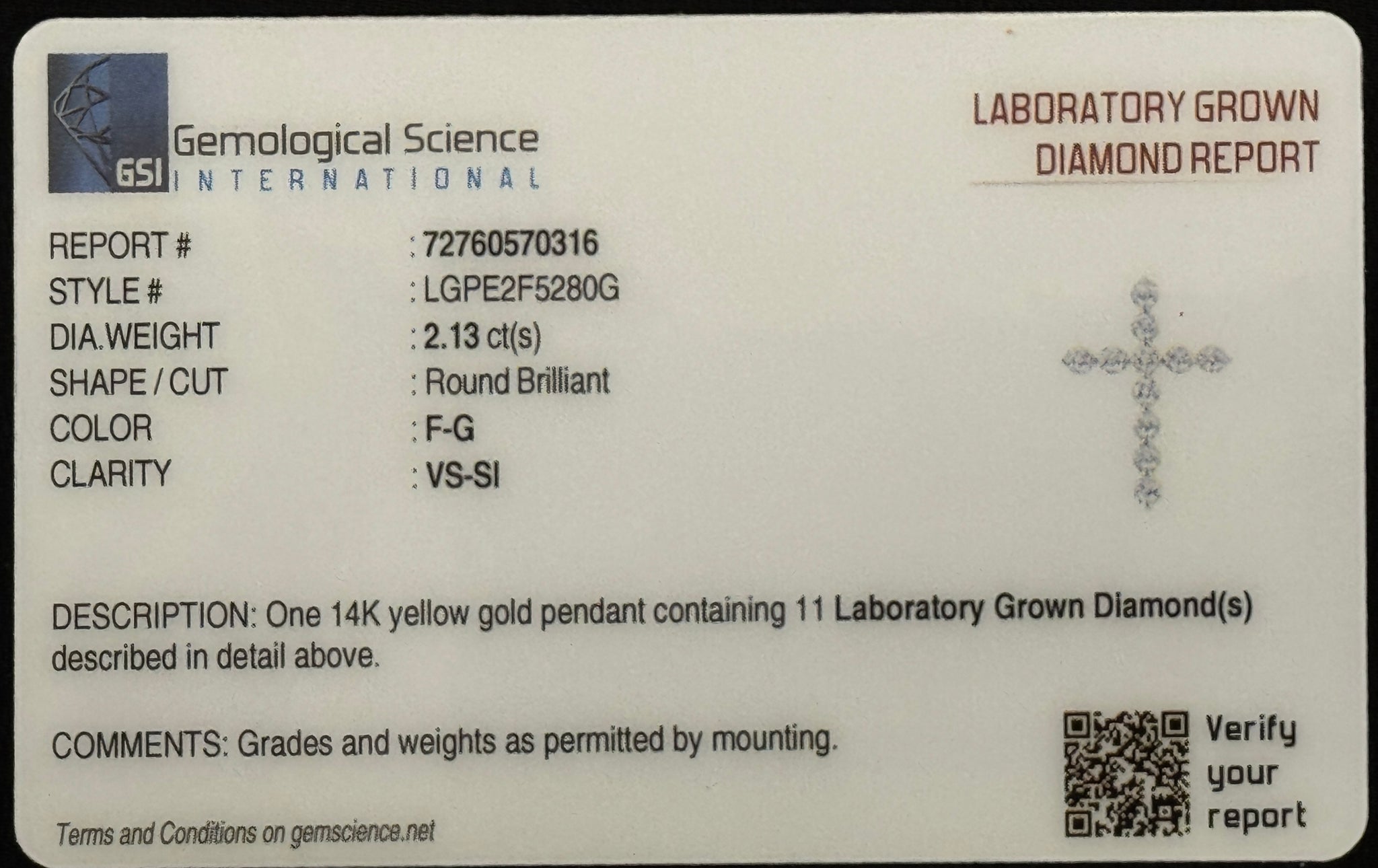 14K YELLOW GOLD 2.13 CARAT CERTIFIED LAB GROWN DIAMOND PENDANT CROSS WITH 18 INCH GOLD CHAIN